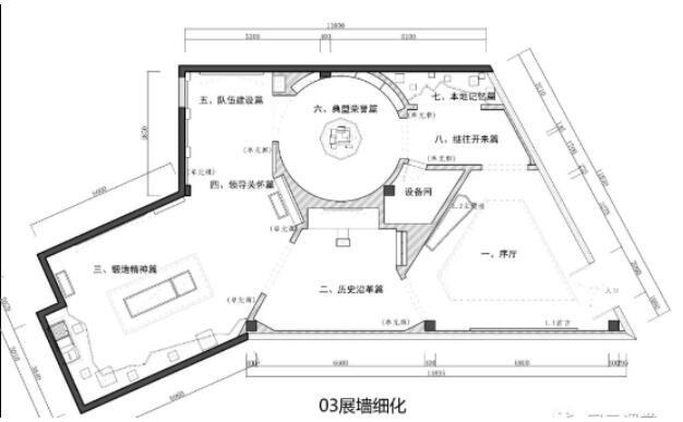 03展墙细化:完善隔墙细节,尽量将空间利用率最大化,完善段首、图版、展柜、展项等所有平面布局的墙面设计,考虑好展墙的前后层次。